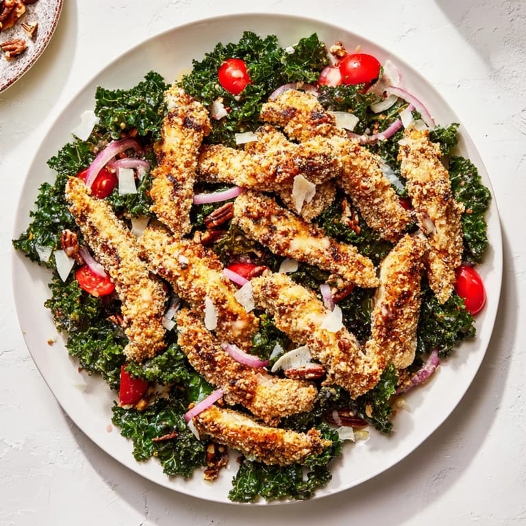 Save to Pinterest My neighbor knocked on my door one Tuesday with a bag of kale from her garden, and I stared at it wondering what to do besides another smoothie. I had leftover chicken breasts thawing and a sudden craving for texture, so I breaded them with panko I found in the back of the pantry. The dressing came together from whatever I had: maple syrup, mustard, a splash of vinegar. That improvised dinner turned into something I now make on purpose, not by accident.