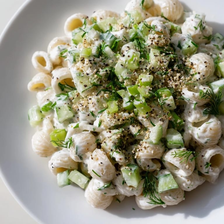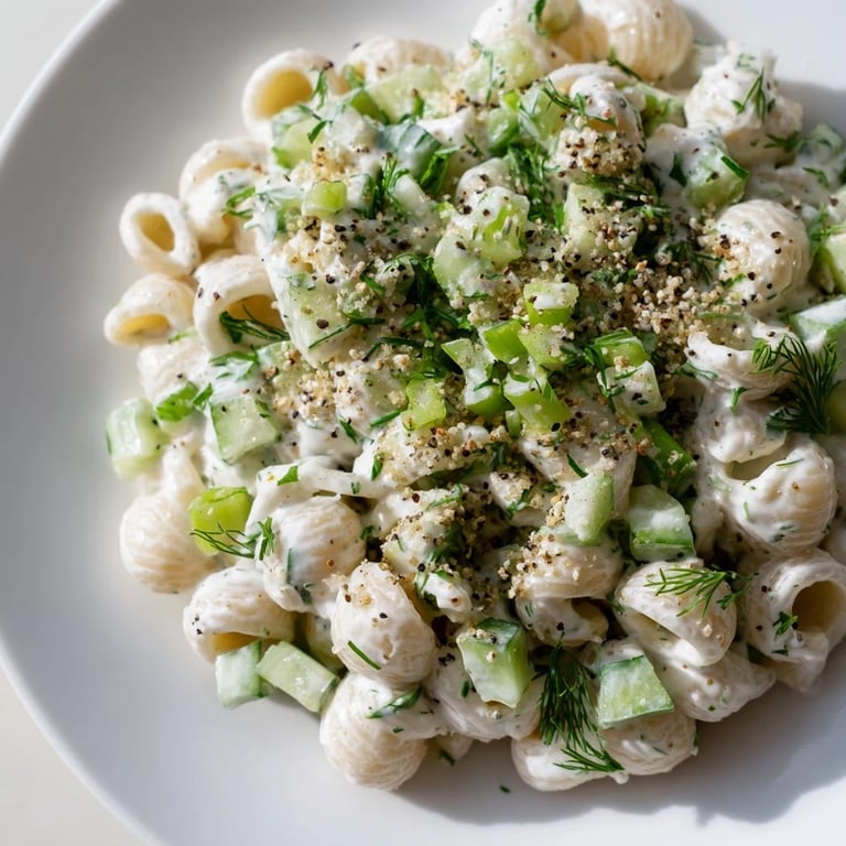 This pasta salad holds its own perfectly as a main dish for a light lunch, but it also shines next to grilled chicken, smoked salmon, or even as part of a larger picnic spread. I love serving it in a shallow bowl so people can see all those colorful bits of green cucumber and flecks of seasoning scattered throughout.