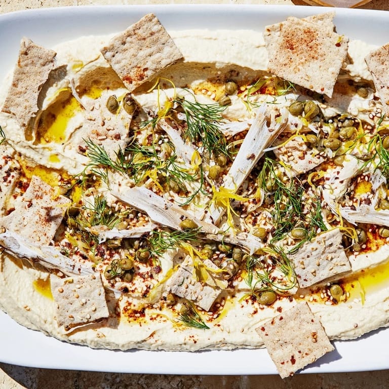 - Bring the platter to the table immediately so guests can enjoy it at its crispest. Encourage them to scoop fish and hummus together with a cracker, experiencing all the layers in one bite.