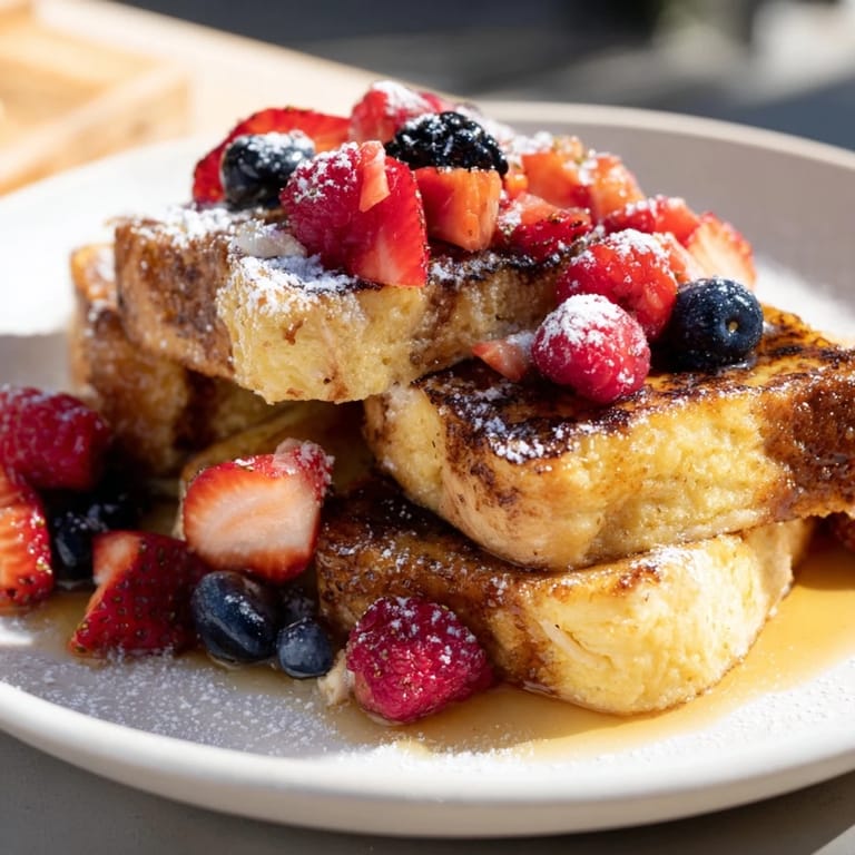 - Arrange French toast slices on plates. Top generously with fresh berries, drizzle with maple syrup, and dust with powdered sugar if desired.