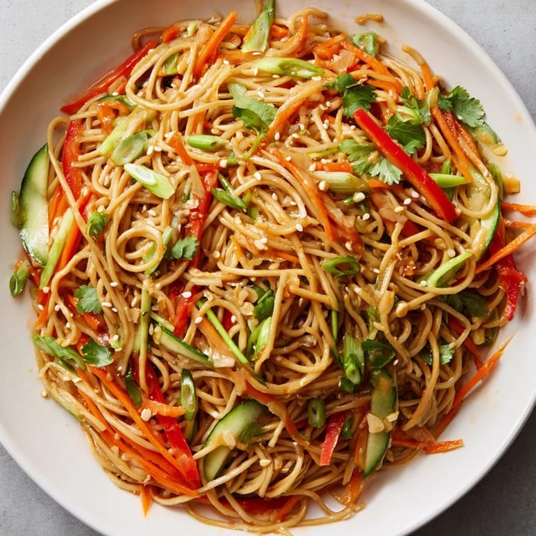 This salad is a canvas, not a commandment. I've made versions with shredded chicken tucked into the noodles, crumbled tofu for vegetarian protein, edamame for color and substance. Snap peas, shredded radish, thinly sliced cabbage—they all work. The principle stays the same: cold noodles, fragrant oil, bright acid, fresh vegetables in balance.