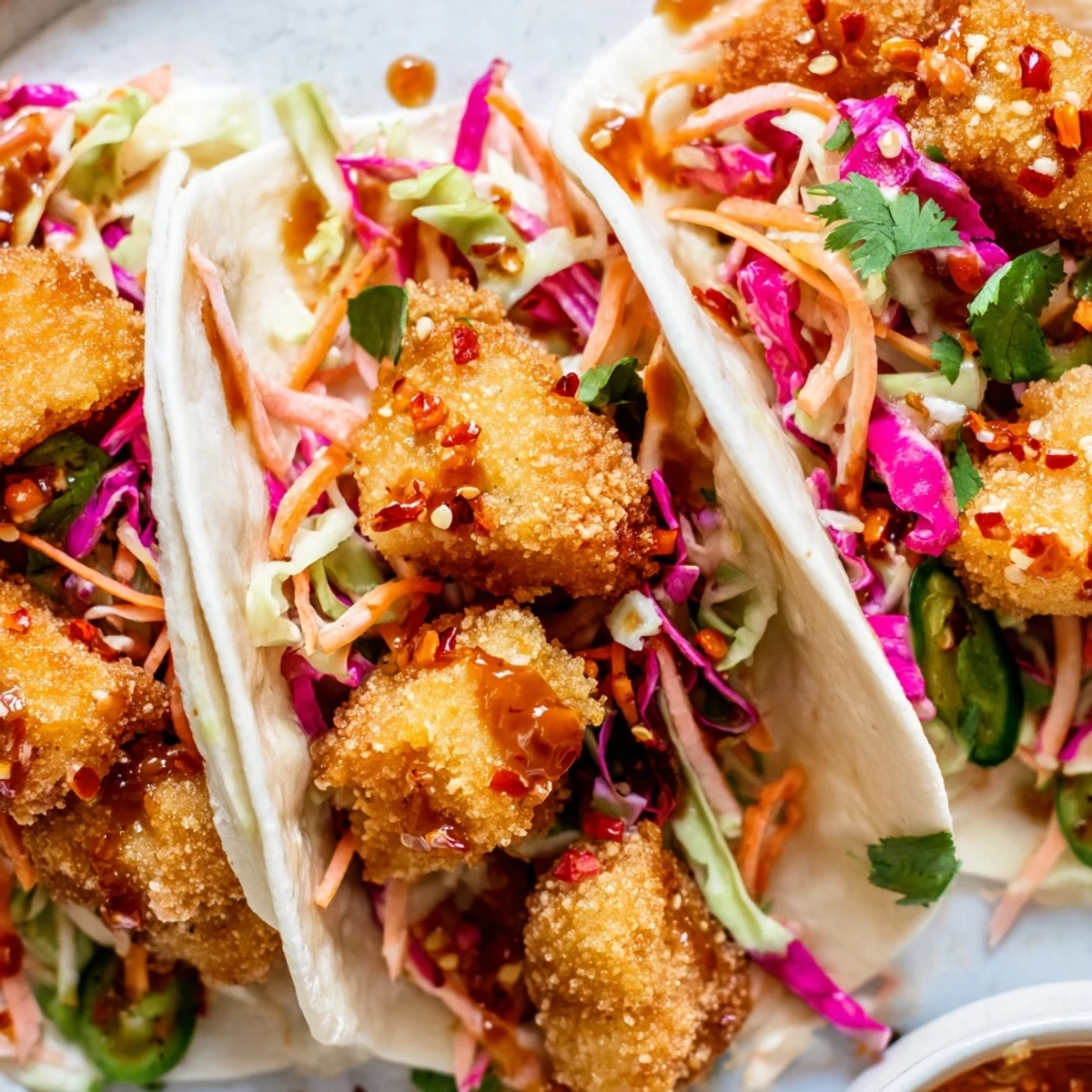 - Warm tortillas directly over a gas flame or in a dry skillet for just a few seconds to make them pliable. Place a few crispy chicken pieces in each tortilla, top with a generous spoonful of slaw, drizzle with hot honey, and sprinkle cilantro over everything. Serve right away with lime wedges so people can customize the brightness.