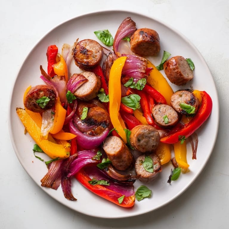 Save to Pinterest My family always gathers around this dish on casual nights, enjoying the colorful vegetables and flavorful sausages together.