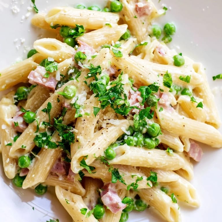 Save to Pinterest The first time I made this pasta was on a rainy Tuesday when I had half a ham leftover from Sunday dinner and a bag of peas screaming to be used. My kitchen smelled like butter and comfort, and something about the sweetness of those peas against salty ham just clicked.